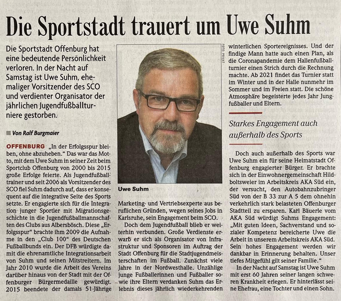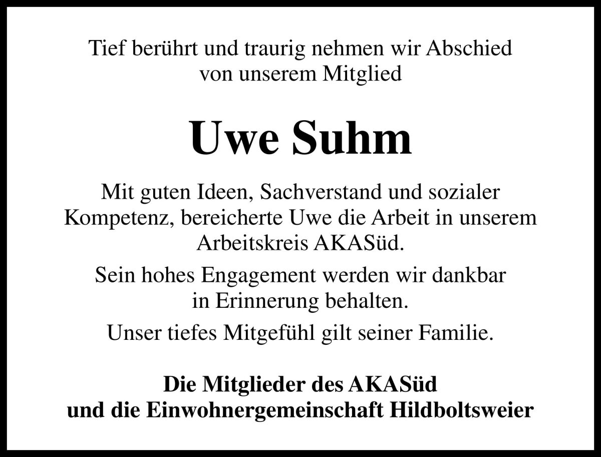 Tief berührt und traurig nimmt der AKA Süd und die Einwohnergemeinschaft Hildboltsweier Abschied von ihrem Mitglied Uwe Suhm, der im Alter von nur 60 Jahren verstorben ist.